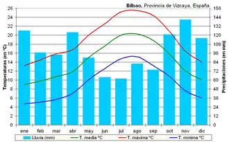 Bilbao heeft een vochtig zeeklimaat met zachte temperaturen gedurende het hele jaar, de zomers zijn voor Spaanse begrippen niet bijzonder warm. De winters zijn mild zonder uitgesproken koud weer. De meeste neerslag valt in de herfst en de winter. De tendens van ‘gematigde zomers’ begint ietwat af te brokkelen. Er zijn meermaals lange hittegolven opgetreden van meer dan 20 dagen. De gemiddelde maximumtemperatuur ligt in juli ongeveer rond de 25 graden, in december en januari rond de 13 graden Celsius. De hoogste van Bilbao werd gemeten in 1947, 42 graden Celsius. De meest intense neerslag viel op 26 augustus 1983, meer dan 250 millimeter, dat ook de overstroming van de rivier Nervión veroorzaakte.
