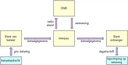 Het principe van zoals hierboven aangegeven blijft grotendeels gehandhaafd, al de aangegeven stappen worden uitgevoerd. Maar de betrokken banken zullen ook onderling een regeling moeten treffen om de betaling uitgevoerd te krijgen. Banken houden geen rekeningen bij elkaar aan, iedere bank in Nederland houdt een rekening aan bij de Nederlandsche Bank (DNB). Alle betalingen lopen dus in wezen via DNB. In stappen uitgewerkt: