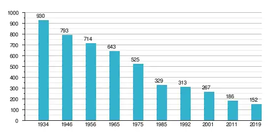 De grootste leeftijdscategorie bestaat uit 65 tot en met 69-jarigen (28 personen), gevolgd door inwoners tussen de 70-74 jaar (22 personen) en tussen de 60-64 jaar (21 personen).[3] In totaal werden er in 2011 slechts 8 kinderen jonger dan 15 jaar geregistreerd (4%), terwijl er 82 inwoners van 65 jaar of ouder werden geteld (44%).