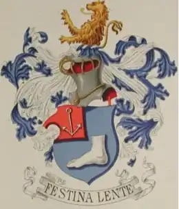 - Wapen: in blauw een zilveren rechtervoet en in een rood vrijkwartier een zilveren anker.