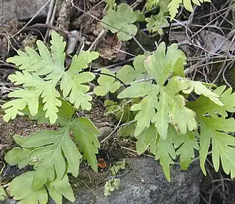 Noordse streepvaren (Asplenium septentrionale) met een dichotoom vertakt blad (herhaald in twee gelijke slippen gedeeld blad). -