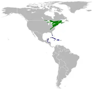 - Setophaga caerulescens caerulescens: zuidelijk en zuidoostelijk Canada en de noordoostelijke Verenigde Staten.
