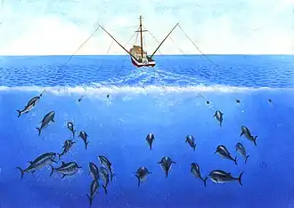 De tonijnen kunnen ook worden opgejaagd met staande netten zodat ze in een afgeschermd deel van de kust zwemmen en hier massaal worden afgemaakt. Dit vindt onder andere plaats in Spanje. De Spaanse schilder Salvador Dalí heeft dit tafereel vereeuwigd in zijn schilderij Tuna Fishing.[3]