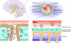 De bloed-hersenbarrière[1] scheidt de bloedsomloop van het, buiten de cellen gelegen, extracellulair vocht van de hersenen. De bloed-hersenbarrière strekt zich langs alle haarvaten van het centrale zenuwstelsel uit, en bestaat uit tight junctions. Dat zijn verbindingen tussen de celmembranen van naast elkaar gelegen cellen, die de haarvaten omgeven, en die elders in de bloedsomloop niet gevonden worden. Endotheelcellen beletten op deze wijze het doordringen in de hersenvloeistof van microscopisch kleine partikels, bijvoorbeeld bacteriën, en van grote in water oplosbare moleculen. Ze laten echter vetoplosbare, anorganische kleine moleculen, zoals de ademhalings-gassen zuurstof en koolzuur, en vetoplosbare hormonen zonder meer passief door, via diffusie. Daarnaast hebben de cellen van de barrière actieve transportmechanismen voor, van de spijsvertering afkomstige, wateroplosbare kleine organische moleculen, zoals glucose. Een actief transportmechanisme is de mogelijkheid van bepaalde cellen, om een molecuul tegen een gradiënt in te verplaatsen. Er wordt als het ware tegen de stroom ingepompt; dit kost energie, in tegenstelling tot diffusie. De barrière bestaat verder nog uit een extra dikke basale membraan en uit de eindvoetjes van astrocyten.