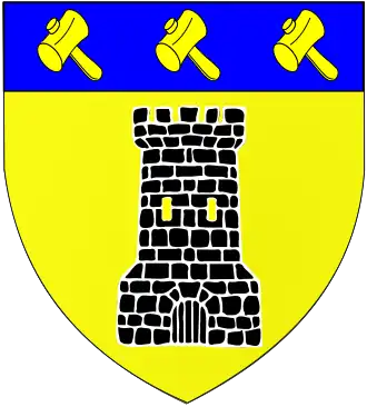 - 1971: In goud, een burcht gekanteeld van drie stukken van sabel, geopend en verlicht van het veld, gemetseld van zilver, en een schildhoofd van azuur, beladen met drie hellende klophamers van goud. Een helm van zilver, gekroond, getralied, gesierd en omboord van goud, gevoerd en gehecht van keel. Dekkleden: goud en sabel. Helmteken: een klophamer van het schild, tussen een vlucht van azuur. Wapenspreuk: 'Honore labore amore patriae' in letters van sabel, op een lint van goud. Bovendien, voor de [titularis] het schild gedekt met een gravenkroon, en gehouden door twee leeuwen van goud, geklauwd en getongd van keel.