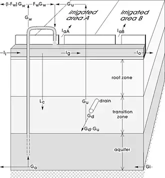 waar C = zoutconcentratie, Ci = C van het irrigatiewater, Cc = C van het opstijgingswater, Cp = C van het doorspoelingswater, en Ss = toename van de berging van zout in de onverzadigde zone.
