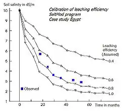 De keigronden in de delta van de rivier de Nijl in Egypte, werd een veel betere ontzoutingsefficiëntie gevonden in de orde van 0,7 tot 0,8 (zie de calibratiefiguur). De figuur laat verschillende doorspoelkrommen zien met een verschillende ontzoutingsefficiëntie als aangenomen in het hydrologische zoutmodel SaltMod,[27] met gegevens van het Mashtul-proefveld. De waargenomen waarden van het zoutgehalte van de bodem komen het beste overeen met een ontzoutingsefficiëntie van ongeveer 0,75.[28] De figuur illustreert het calibratieproces van de doorspoelefficiënte die moeilijk direct is te meten.