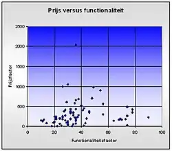 Er is geen relatie tussen prijs en functionaliteit. Pakketten met een beperkte functionaliteit (weinig functies) kunnen zowel goedkoop als duur zijn. Voor pakketten met een uitgebreide functionaliteit (veel functies) geldt hetzelfde. In de grafiek rechts wordt dat nog eens visueel aangetoond.