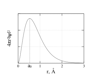 Radiale functie van de eerste reële bolfunctie. Hierbij is a0 de bohrstraal, 53 pm of 0,53 Å.