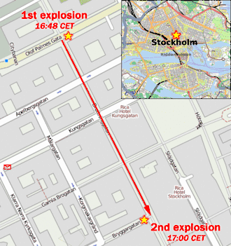 De eerste explosie vond plaats om 16:48 toen een Audi 80 Avant ontplofte aan de kruising van de Olof Palmes Gata en de Drottninggatan, de bekendste winkelstraat van Stockholm. De auto was geladen met flessen met lpg. Bij deze explosie raakten twee omstanders gewond.
