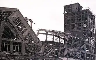 De Venlose binnenstad na de bombardementen, met rechts de zwaar beschadigde toren van de Sint-Martinuskerk