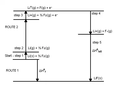 De vormingsenthalpie ΔHf van lithiumfluoride, dat wil zeggen de enthalpieverandering bij de vorming van lithiumfluoride uit de niet-ontleedbare stoffen lithium en fluor, is in het diagram in vijf stappen opgebouwd: