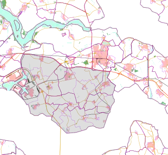| Gemeentegrenzen Wijkgrenzen Buurtgrenzen Autosnelweg Secundaire weg Spoorweg | ██ Geselecteerde gemeente ██ Bebouwd gebied ██ Bos of park ██ Binnenwater, rivier of kanaal |