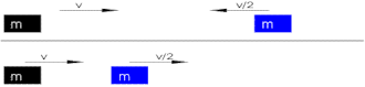 Bijvoorbeeld twee massa's (1 en 2) bewegen voor de botsing naar rechts. Hun gegevens zijn (m = massa, v = snelheid)