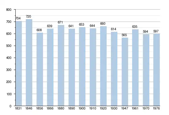 - Bronnen:NIS, Opm:1831 tot en met 1970=volkstellingen, 1976= inwoneraantal op 31 december