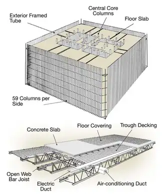 De stalen kolommen waren erg smal te noemen. 28 inches breed, ofwel 71 centimeter. Daartussen werden de betonnen vloeren verticaal en horizontaal ondersteund met 'floor trusses' tot aan het dak (de 'floor trusses' worden gezien als een belangrijke factor voor de instorting).[23]