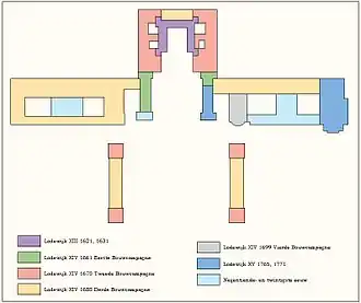 In groen de restauraties en renovaties van 2000-2010. De opera, het gedeeltelijk vergulde dak van het corps de logis en het voorplein werden hersteld. De zuidelijke vleugel en de menus werden grootscheeps verbouwd. Het beeld van Lodewijk XIV is van het cour d'honeur verdwenen.