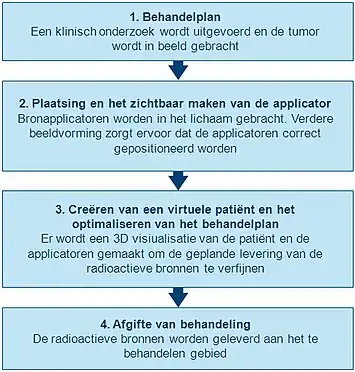 Met deze informatie kan een plan voor de optimale verdeling van de stralingsbronnen worden ontwikkeld. Dit houdt onder andere in hoe de brondragers (applicatoren), die worden gebruikt om de straling te leveren aan het te behandelen gebied, zouden moeten worden geplaatst en gepositioneerd. Applicatoren zijn niet radioactief en zijn meestal naalden of kunststoffen katheters. De specifieke aard van de applicator die wordt gebruikt is afhankelijk van het type kanker dat wordt behandeld en de kenmerken van de betreffende tumor.