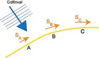 Als een kust gekromd is, is de hoek van inval van de golven langs een kust niet constant, en dus ook het zandtransport langs de kust niet constant. In bijgaande figuur vallen de golven bij A bijna loodrecht in, en is er dus een klein transport. Bij C vallen de golven onder een grote hoek in, er is dus een groot transport. In het kustvak A-B verdwijnt dus SB−SA m3/s aan zand. Als de lengte van dit kustvak x m is (en we nemen aan dat de erosie in dit vak gelijkmatig verdeeld is) dan heeft dit kustvak dus een erosie van (SB−SA)/x m2/s. Stel dat de actieve hoogte van het profiel h m is, dan is de kustachteruitgang in dit stuk dus (SB−SA)/hx m/s (overigens zal deze achteruitgang meestal in m/jaar uitgedrukt worden).