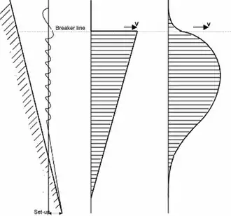 Als een eenvoudig lineair rekenmodel gebruikt wordt en regelmatige golven vindt men op de brekerlijn de maximale brandingsstroomsnelheid die lineair afneemt naar de waterlijn, waar de snelheid nul is. Bij modellen die rekening houden met het onregelmatige karakter van golven ligt de maximale snelheid net iets landwaarts van de brekerlijn. In de figuur is links het kustprofiel aangegeven, met daarin de brekende golven. De golven breken op de brekerlijn. De middelste figuur is de snelheidsverdeling met regelmatige golven, de rechter figuur de werkelijke verdeling met onregelmatige golven.