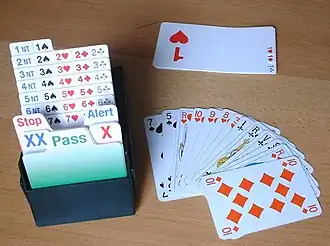 - Een volledig kaartspel van 52 kaarten (geen jokers) is verdeeld over de vier spelers, zodat iedere speler 13 kaarten heeft.