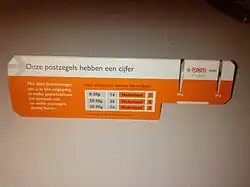- Via een hefboom-principe (een voorbeeld is de kartonnen brievenweger die TNT gratis uitdeelde bij de introductie van een nieuwe serie genummerde zegels zonder waarde-aanduiding, zie afbeelding: wanneer het poststuk in de gleuf wordt geplaatst kan, afhankelijk van het al dan niet kantelen van de weger de gewichtsklasse en dus de frankering worden vastgesteld)