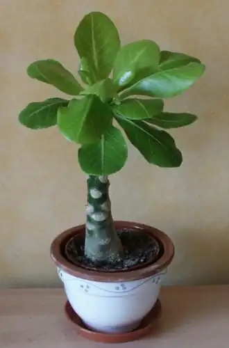 Het is een plant met één (meestal in cultuur) of meerdere, succulente, kale, tot 4,5 m (in cultuur lager) hoge stammen, die verdikt aan de basis zijn en naar de top toe dunner worden. De top eindigt in een compacte bladrozet van vlezige, omgekeerd eironde, glanzende, helder- tot donkergroene, 10-20 × 6,5-11 cm grote, gaafrandige bladeren. De bladeren worden vanuit de top gevormd en de onderste, verouderde bladeren worden afgestoten waarna er een kale stam met bladlittekens overblijft, vergelijkbaar met een palm. De crèmekleurige tot gele, trompetvormige, geurende bloemen groeien in clusters van drie tot acht stuks op 1-3 cm lange bloemstelen in de bladoksels. De vijf kroonbladeren vormen een 7-14 cm lange kroonbuis. Vermoedelijk heeft de soort kruisbestuiving nodig om vruchten te vormen, waarvan wordt aangenomen dat deze wordt verzorgd door een inheemse vlinder met een lange roltong uit de familie pijlstaarten (Sphingidae), die mogelijk al is uitgestorven. De vruchten zijn 1,3-1,9 × 09-1,3 cm grote doosvruchten die talrijke bleke, eivormige, 0,8-1,2 mm grote zaden bevatten.