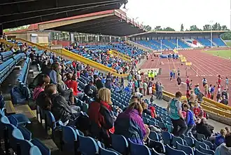Het Alexander Stadium waar de Birmingham Diamond League sinds 2010 wordt georganiseerd.Paula Radcliffe tijdens haar race van over 10.000 meter bij de British Grand Prix van 2004.