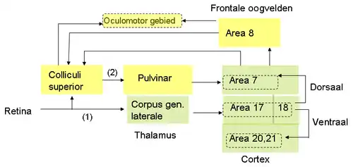 ■ circuit dat de oogbewegingen en saccades aanstuurt Cijfers slaan op gebieden van Brodmann. |