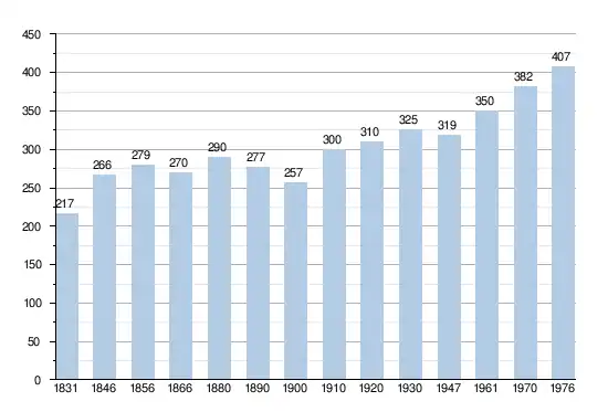 - Bronnen:NIS, Opm:1831 tot en met 1970=volkstellingen; 1976 = inwoneraantal op 31 december