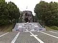 Oorlogsmonument met kerktoren op achtergrond -