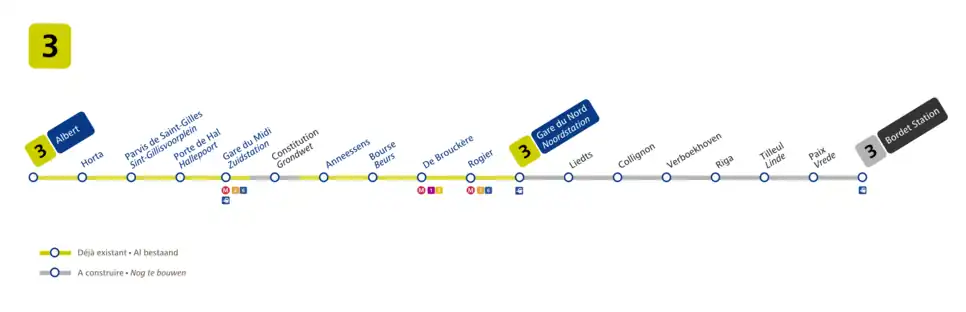 De onderstaande afbeelding toont het volledige tracé. Het deel in het groen is de reeds bestaande Noord-Zuidpremetrotunnel. In 2024 moet het deel van Albert tot het Noordstation klaar zijn. Halte Lemonnier blijft een tramhalte en wordt niet omgebouwd tot metrostation. In plaats daarvan komt er een nieuw, naastgelegen metrostation Toots Thielemans (op de onderstaande afbeelding aangeduid onder de oude naam Grondwet).[9][10]