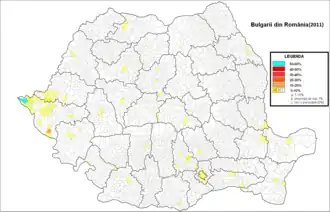 In de volkstelling van 2011 werden er 7.336 etnische Bulgaren geregistreerd. De afgelopen decennia is het aantal Bulgaren in Roemenië drastisch afgenomen, vooral in de districten Constanța en Tulcea in de historische regio Dobroedzja. In de 21e eeuw woonde de grootste gemeenschap van Bulgaren in het district Timiș in het westen van het land.