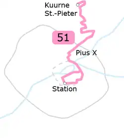 Buslijn 51 in Kortrijk verbindt de eindhaltes Station Kortrijk en Kuurne Sint-Pieter. Samen met lijn 50 vormt zij de voorstadslijn 5 die het centrum van Kortrijk verbindt met de Pius X-wijk en met Kuurne. Op die manier vormt dit een belangrijke verbinding tussen de binnenstad en het noordoosten van het stedelijk gebied waartoe Kuurne ook behoort. De lijn komt onder meer voorbij het winkelcentrum K in Kortrijk, de Sint-Maartenskliniek, gaat doorheen de wijken Pius X en eindigt in de Sint-Pieterswijk in Kuurne.