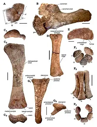 Er werd een groot aantal onderscheidende kenmerken vastgesteld. Het zijn autapomorfieën, unieke afgeleide eigenschappen. De onderzijde van het wervellichaam van de halswervels is overdwars hol. De halswervels hebben geen pleurocoelen. De achterste ruggenwervels zijn licht opisthocoel. De middelste tot achterste ruggenwervels hebben pleurocoelen met een gehoekte bovenrand. De achterste ruggenwervels hebben pleurocoelen waarvan de bovenrand op dezelfde hoogte of hoger ligt dan de bovenrand van het wervellichaam. De doornuitsteeksels van de middelste tot achterste ruggenwervels hebben zijranden die in achteraanzicht min of meer evenwijdig lopen. Bij de achterste ruggenwervels zijn de voorste en achterste richels tussen het doornuitsteeksel en het zijuitsteeksel sterk ontwikkeld, een diepe verticale zakvormige holte begrenzend. De wervelbogen van de achterste ruggenwervels hebben gevorkte richels tussen het wervellichaam en het achterste gewrichtsuitsteeksel. Bij de ruggenwervels is de richel op de voorkant van het doornuitsteeksel ruw en breed, bijna over de volle lengte doorlopend. Bij de middelste en achterste ruggenwervels ondersteunt slechts een enkele richel de hyposfeen of achterste gewrichtsuitsteeksel. Bij het doornuitsteeksel van de middelste en achterste ruggenwervels ontbreekt een zijwaartse richel naar het achterste gewrichtsuitsteeksel. Bij de middelste en achterste ruggenwervels is in de wervelboog het voetstuk onder de achterste gewrichtsuitsteeksels even hoog of hoger dan de hoogte van het wervellichaam. De voorste staartwervels hebben massieve, niet gepneumatiseerde, wervelbogen. Bij de voorste staartwervels lopen de richels tussen het doornuitsteeksel en de voorste gewrichtsuitsteeksels gevorkt naar beneden, naar onderen en naar het midden. De richel tussen het doornuitsteeksel en de achterste gewrichtsuisteeksels is bij de voorste staartwervels zwak ontwikkeld waardoor het gewrichtsfacet ligt van de middenlijn gedraaid is. De voorste staartwervels hebben een hyposfeen, secundair gewrichtsuitsteeksel. De middelste staartwervels hebben een vlakke onderzijde. De voorste gewrichtsuitsteeksels van de middelste staartwervel staan schuin naar voren onder een hoek van 45°. Het schouderblad heeft een goed ontwikkelde processus acromialis. De processus acromiaLis bevindt zich bijna precies halverwege het hoofdlichaam. De processus acromialis beslaat minstens de helft van het schouderblad. Het schoudergewricht ligt vrijwel plat of zijdelings op het schouderblad. De bovenrand van het ravenbeksbeen ligt in zijaanzicht beneden het niveau van de onderste verbreding van het schouderblad en is daarvan gescheiden door een V-vormige inkeping. Het opperarmbeen is lichtgebouwd met een schachtbreedte minder dan 27% van de lengte. De knobbel van het opperarmbeen die met het spaakbeen articuleert wordt op de voorzijde gespleten door een inkeping. De deltopectorale kam is onderaan sterk verbreed. De processus olecrani van de ellepijp is slechts rudimentair ontwikkeld. Bij onderste condyle van het eerste middenhandsbeen maakt de as overdwars een hoek van ongeveer 20° met de lengteas van de schacht. Het bovenste beenschort van het schaambeen vormt een opvallend naar beneden en binnen gericht uitsteeksel. Het dijbeen heeft een lage lengtekam op de buitenrand van de binnenzijde van de voorkant, die zich naar beneden splitst in twee kleinere kammen, ieder uitlopend naar een van de onderste gewrichtsknobbels. Het onderste uiteinde van het scheenbeen is ongeveer een kwart breder dan de breedte van de middelste schacht. De minimale diameter overdwars van de schacht van het derde en vierde middenvoetsbeen is ongeveer gelijk aan de diameters van het eerste en tweede middenvoetsbeen. Het vijfde middenvoetsbeen is kleiner dan het vierde.