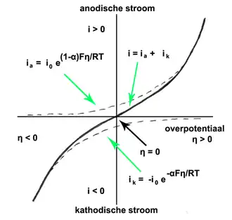 De stroomdichtheid aan een elektrode is de optelsom van de stroomdichtheden van de anodische en de kathodische halfreacties. Beide halfreacties verlopen gelijktijdig en hun reactiesnelheid - en daarmee de bijbehorende stroomdichtheid - wordt bepaald door de elektrodepotentiaal. De stroomdichtheid bestaat daarmee uit een anodische en een kathodische component (de anodische stroomdichtheid ia en de kathodische stroomdichtheid ik):