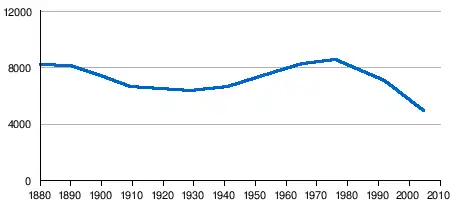 Onderstaande figuur toont het verloop van het inwoneraantal vanaf 1880.[1]