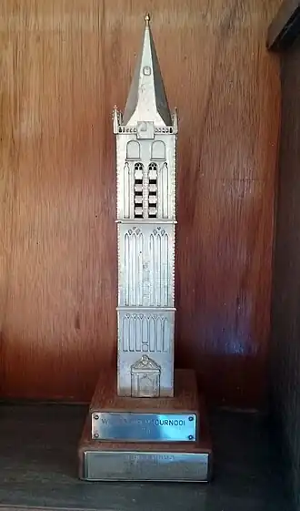 De trofee van het Wijkertorentoernooi in de prijzenkast.