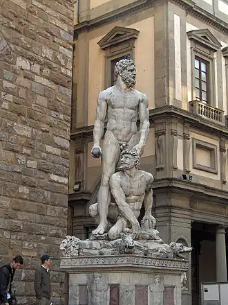 De dood van Cacus wordt toegeschreven aan Hercules. Toen deze vanuit Spanje terugkeerde van zijn 10e werk, ‘de runderen van Geryones’, liet hij de runderen grazen langs de Tiber. Nadat hij in slaap was gevallen, werden er vier door Cacus gestolen. Deze verborg ze in zijn hol. Hij had ervoor gezorgd dat hun sporen niet gevolgd konden worden door ze aan hun staart naar binnen te trekken. Toen Hercules wakker werd, miste hij de runderen, maar kon ze niet vinden. Hij besloot te vertrekken met de rest van de kudde, maar toen hij vertrok werd er in het hol met geloei gereageerd op het geloei van de vertrekkende runderen. Daarop ontdekte Hercules het hol en doodde hij Cacus met zijn knuppel.