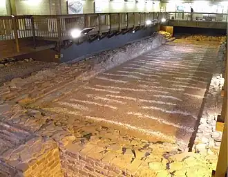 Maquette van de Romeinse baden van het legioenfort. Enkel de natatio (midden rechts) en een deel van het frigidarium (haaks op de natatio, rechtsboven op de foto) zijn opgegraven.