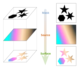 Cairo maakt gebruik van de volgende concepten: Source, Mask en Surface. Op de Mask kunnen eenvoudige vormen of woorden getekend/geschreven worden. De Source bevat een kleur, een gradiënt of een afbeelding, zoals een bitmap- of vectorafbeelding. Het uiteindelijke resultaat, zichtbaar op een Surface, wordt verkregen door de Source en de Mask te combineren.