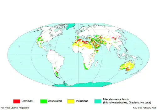De meeste Calcisols komen voor in combinatie met Solonchaks, wat eigenlijk door zout beïnvloede Calcisols zijn, en andere gronden met een accumulatie van kalk. Het totale oppervlak aan Calcisols wordt geschat op ongeveer 1000 miljoen ha., vrijwel uitsluitend in aride en semi-aride gebieden in de tropen en subtropen.