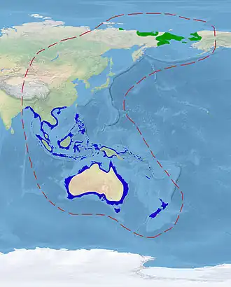 Verspreidingsgebied: rode onderbroken lijn; Groen: broedgebieden; Blauw: overwinterings-gebied.