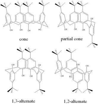 Omdat er rotatie mogelijk is rond de methyleenbruggen kunnen calixarenen verschillende conformaties aannemen. Naast de kelkachtige "cone"-structuur kan calix[4]areen ook voorkomen als "partial cone" "1,2-alternate" of "1,3-alternate". Door de keuze van de reactieomstandigheden bij de synthese van het calixareen is het mogelijk om de vorming van bepaalde conformaties te bevorderen of te verhinderen.