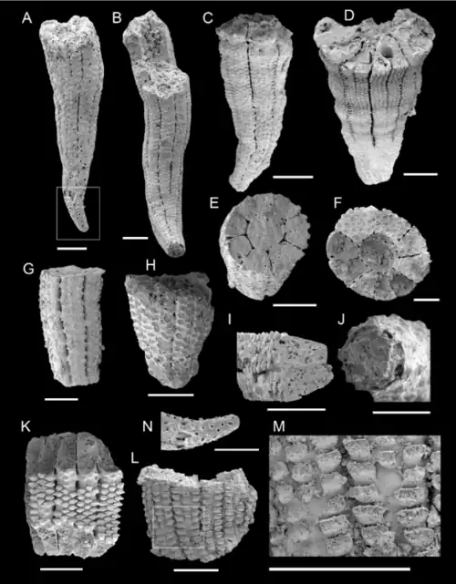 - ↑ a b c Een 'scleritoom' is een verzameling talrijke afzonderlijke sclerieten die samengevoegd werden en waardoor een beschermende schelp gevormd wordt.