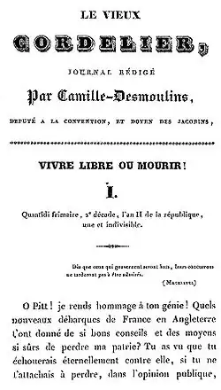 Desmoulins behoorde tot de gematigde cordeliers, een afsplitsing van de jakobijnen. De cordeliers, verantwoordelijk voor de introductie van de leus Vrijheid, gelijkheid en broederschap, splitsten zich na de afschaffing van de monarchie (september 1792) in de dantonisten en de hébertisten.