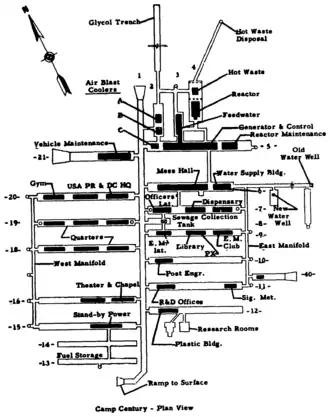 Op de ingangen en veiligheidsuitgangen na, ligt de gehele basis meters onder de oppervlakte van de ijskap. Hoewel Groenland deel uitmaakt van het Deens grondgebied, waar het opslaan van nucleaire wapens bij wet verboden is, was het de bedoeling hier raketten met kernkoppen te installeren.