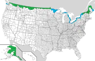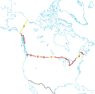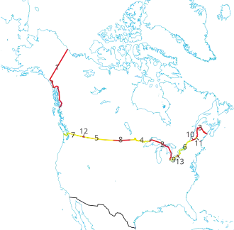 De totale lengte van de landsgrens tussen Canada en de Verenigde Staten is 8.891 kilometer, inclusief watermassa's. De grens tussen Alaska en Canada is 2.475 kilometer lang. Acht van de dertien provincies en territoria van Canada en dertien van de vijftig Amerikaanse staten liggen aan deze landsgrens.[24][25]