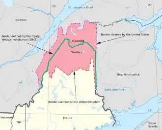 Geschillen over de interpretatie van de grensverdragen en fouten bij de landmeting vereisten aanvullende onderhandelingen. Een betwiste grens bestond tussen New Brunswick in Brits Noord-Amerika en Maine in de VS. Dit was een van de geschillen die beslecht werden in het Webster–Ashburtonverdrag (1842). De groenblauwe lijn op de kaart markeert de definitieve grens. Het verdrag beëindigde de Aroostookoorlog, een geweldloos geschil over de grens tussen Maine en de Provincie Canada. Ook herdefinieerde het verdrag de grens tussen de Britse Provincie Canada aan de ene kant en de staten New Hampshire, Vermont en New York aan de andere kant. Verder werd met dit verdrag het Indian Stream-geschil opgelost, evenals het Fort Blunder-dilemma.