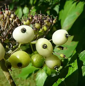 De witte, soms blauw aangelopen vrucht is een ronde, 6-10 mm grote steenvrucht. De gegroefde pit is 4-6 mm lang en 1,5-3 mm breed en heeft een afgeronde top.